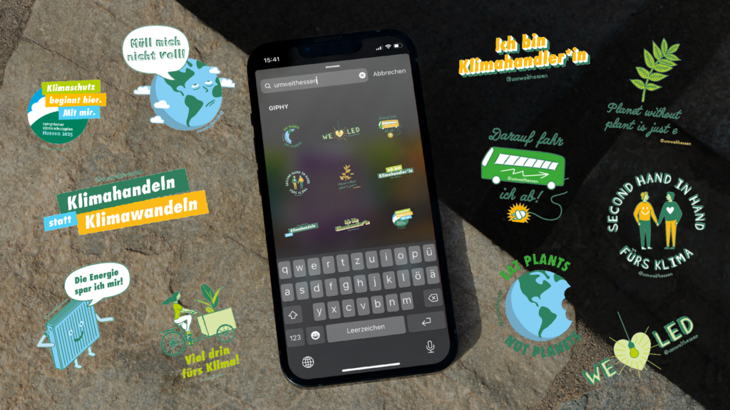 Ein Giphy Sticker-Set bestehend aus acht animierten Illustrationen zum Thema Klimawandel und Klimaschutz. Die Gifs können direkt in Social-Media- und Messenger-Anwendungen über die Sticker-Funktion genutzt werden. Konzeption, Design und Animation im Rahmen der Kampagne Klimahandeln statt Klimawandeln im Auftrag des Hessischen Ministeriums für Umwelt, Klimaschutz, Landwirtschaft und Verbraucherschutz (HMUKLV).
